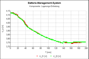 Während der Entladung wird nicht nur die Gesamt-Spannung gemessen, sondern auch die Spannungen der Einzelzellen. Wie das nebenstehende Diagramm zeigt, sind die Spannungsverläufe praktisch deckungsgleich.